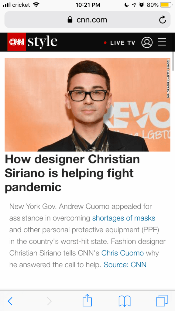 One piece of news that resonated with me was a CNN video about fashion designer Christian Siriano and his sewing staff making masks and other protective equipment during this shortage. This piece resonated with me because again, it was a little bit of good in amongst a bunch of sad, angering news.